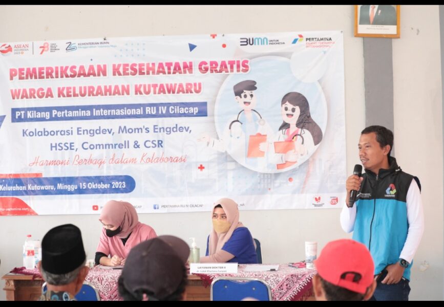 CILACAP – PT Kilang Pertamina Internasional (KPI) RU IV Cilacap menyelenggarakan pemeriksaan kesehatan gratis di aula Kelurahan Kutawaru, Cilacap Tengah, Minggu (15/10/2023). Ini merupakan program rutin, kolaborasi fungsi Engineering Development (Eng Dev), HSSE, Commrel & CSR, dan komunitas Mom’s Eng Dev.
