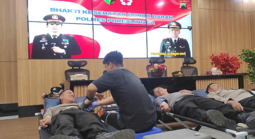 PURBALINGGA – Polres Purbalingga menggelar kegiatan donor darah bekerja sama dengan Unit Donor Darah PMI Purbalingga. Kegiatan digelar di Aula Loka Anindhita Mapolres Purbalingga, Selasa (16/1/2024).