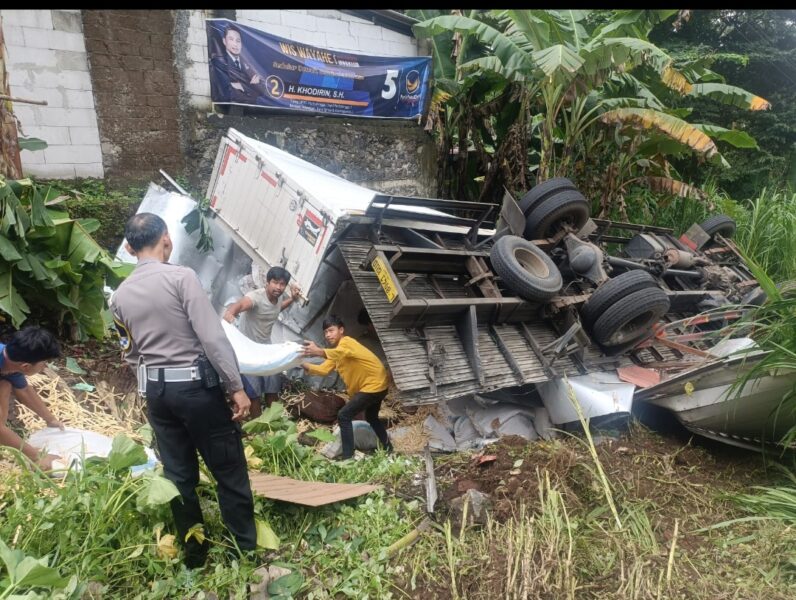 PURBALINGGA – Sebuah truk boks mengalami kecelakaan tunggal di jalan raya Dusun Bayeman, Desa Tlahab Lor, Kecamatan Karangreja, Kabupaten Purbalingga, Sabtu (27/1/2024) siang. Akibat rem blong, truk keluar jalur dan terguling di kebun warga